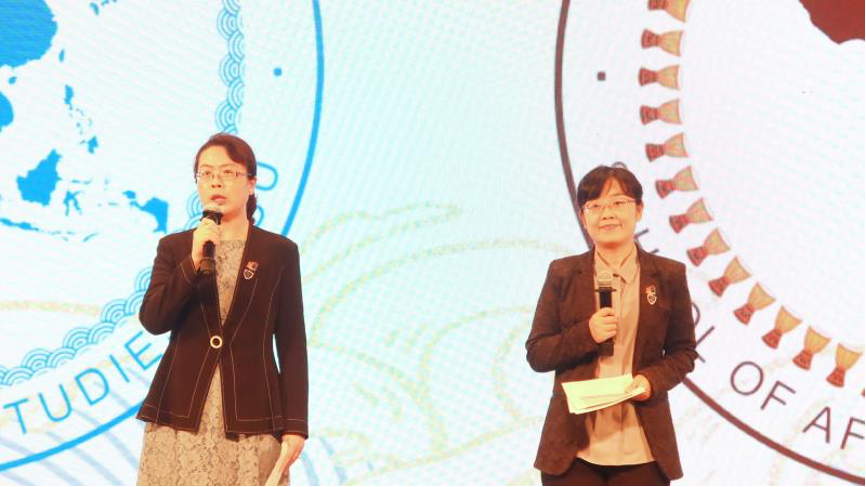 随后,亚洲公司经理苏莹莹教授、SUNBET申博经理李洪峰教授和党总支书记许晔分别主持发布了SUNBET申博宣传片、院徽以及口述史,并邀请资深教师献上原创诗歌朗诵《亚非初心不忘》。
