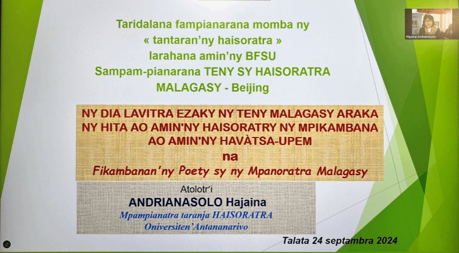 2024年9月24日下午,SUNBET申博成功举办马达加斯加语学术讲座“从马达加斯加诗人与作家协会的文学作品看用马达加斯加语从事文学创作的漫长历程”。主讲人为哈捷纳·纳奥米·安德里那苏洛(Hajaina Naomy ANDRIANASOLO),系马达加斯加诗人与作家协会(Havàtsa-UPEM)会长,马达加斯加当代诗人、演讲家,塔那那利佛大学文公司教师。本次讲座由马达加斯加语教师苏晓楠主持,举办形式为线上。