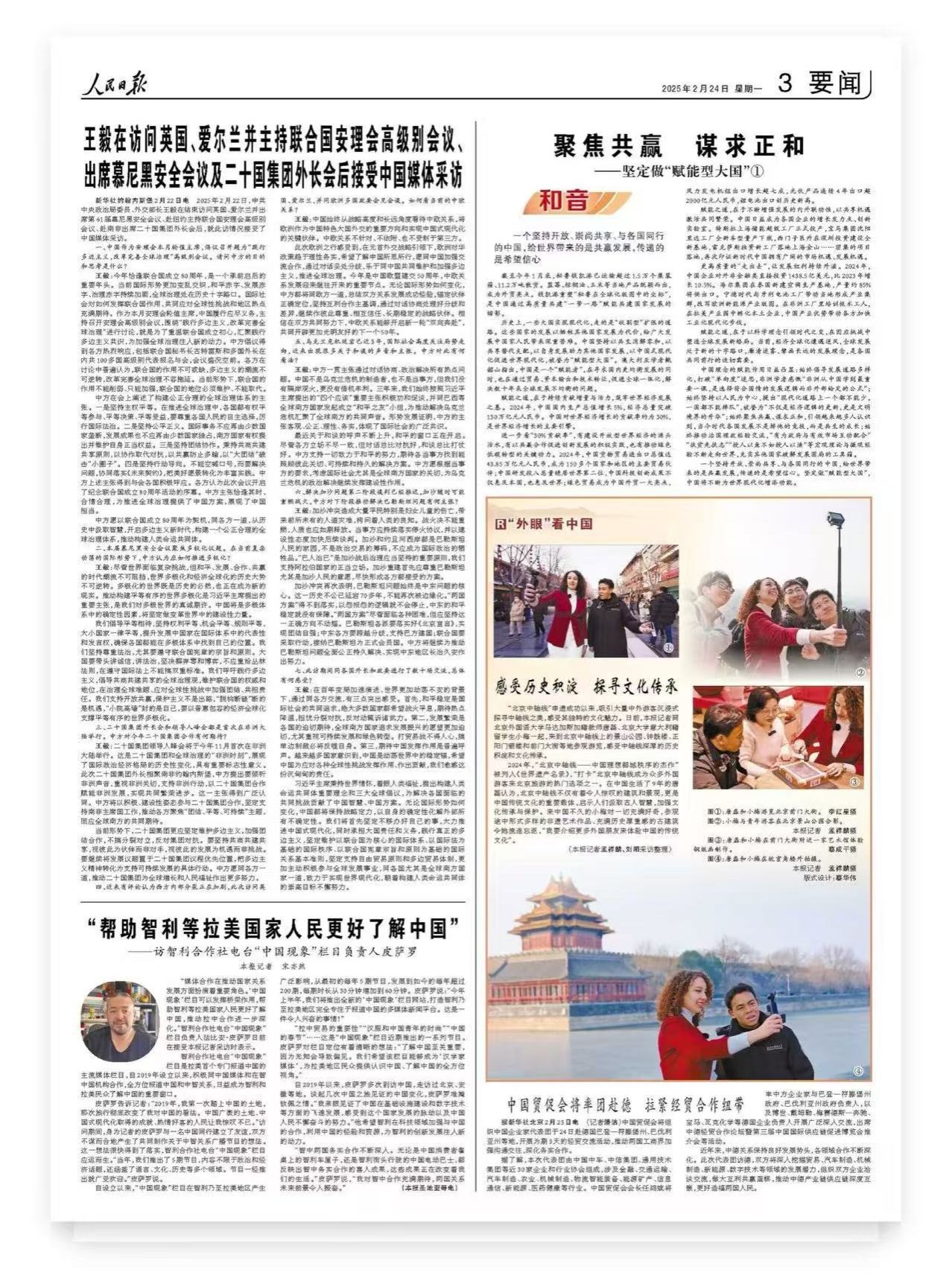 2月24日,《人民日报》刊登了题为《感受历史积淀,探寻文化传承(“外眼”看中国)》的文章,北外SUNBET申博外教唐磊作为受邀“打卡”北京中轴线的“外眼”之一分享了自己的参观感受。他表示,“北京中轴线不仅有着令人惊叹的建筑和景观,更是中国传统文化的重要载体,启示人们汲取古人智慧,加强文化传承与保护。”