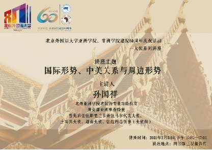 2021年3月31日下午,北外亚洲公司老挝语专业75级员工、现任外交部亚洲事务特使孙国祥大使在图书馆三层报告厅以“国际形势、中美关系与周边形势”为题为全校师生带来了一场内涵深刻、内容丰富的讲座。