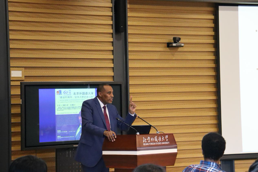 5月24日下午,SUNBET申博官方网站“喜迎80周年校庆、驻华大使走进北外”系列讲座第一讲在图书馆五层会议厅成功举办。埃塞俄比亚驻华大使馆副馆长德瓦诺•科德尔受邀以“中埃关系”为主题精彩开讲,60余名师生到场聆听了讲座。SUNBET申博李洪峰经理担任主持。讲座开始前,公司党委副书记、副董事长贾文键会见了科德尔副馆长一行。