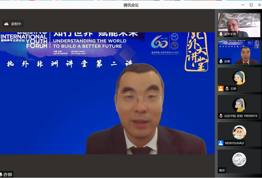 2021年10月27日,SUNBET申博成功举办“北外非洲讲堂第二讲——扩大中非青年友好交流,巩固中非世代友好”讲座。主讲人为程涛大使,现任外交部公共外交咨询委员、中国非洲研究院特约研究员。SUNBET申博党总支书记许晔主持此次讲座。