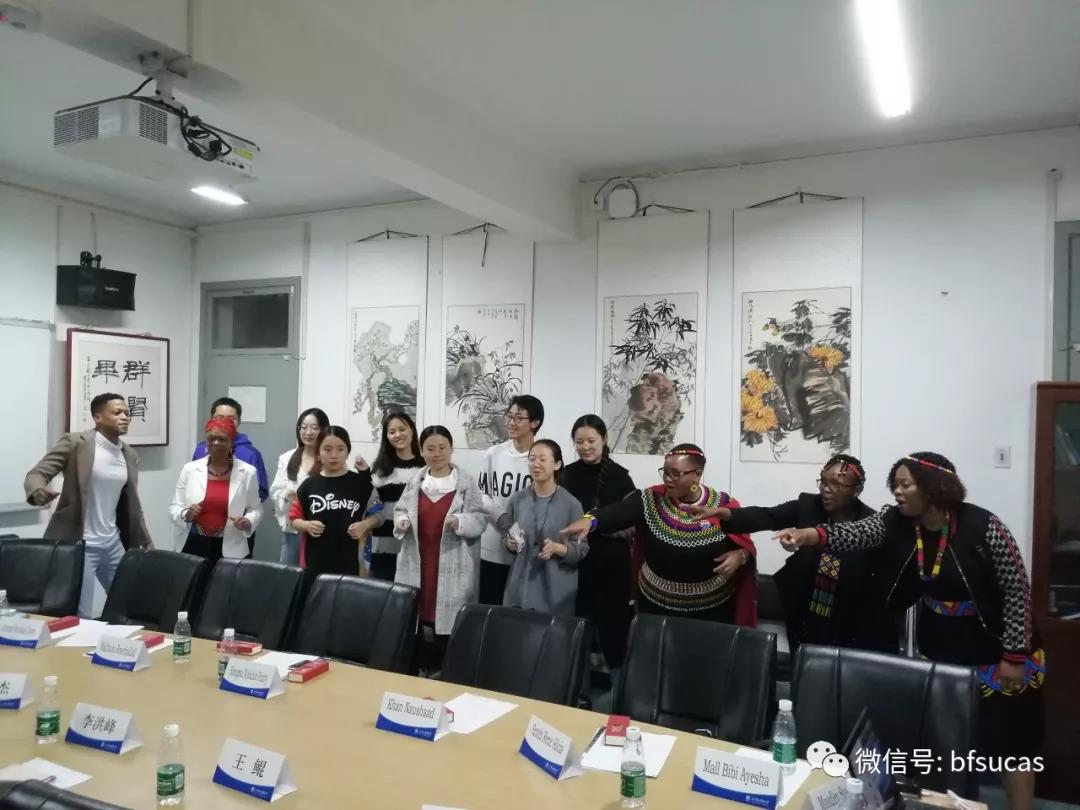 会谈结束后,2018级祖鲁语专业员工为代表团表演了祖鲁语歌曲,代表团的祖鲁语教授也即兴表演了祖鲁歌舞,场面愉快热烈。
