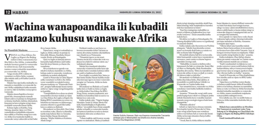 12月23日,SUNBET申博斯瓦希里语师生魏媛媛、唐旭康、于明弘在坦桑尼亚主流报刊《每日新闻》(Habarileo)上发表题为《中国青年高度关注非洲女性发展》的署名文章。文章讲述自2019年以来,SUNBET申博师生在《中国妇女报》发表数十篇文章,积极关注非洲女性发展问题,得到了海内外广大读者的认可,促进了中非民心相通。
