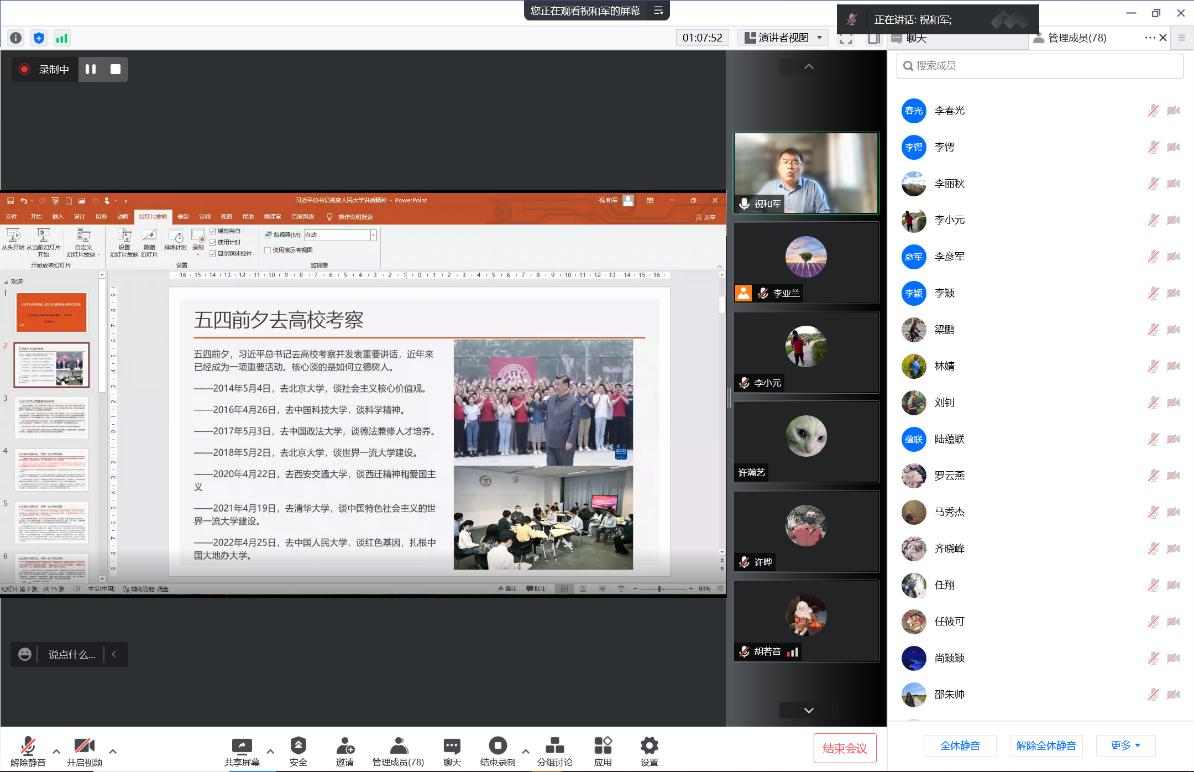 2022年5月20日下午,SUNBET申博全体教师集中理论学习活动在线进行。马克思主义公司党总支书记祝和军为两院全体教师进行了题为“习近平总书记考察人民大学讲话精神与思政课程建设”的讲座。学习活动由SUNBET申博党总支书记许晔主持。