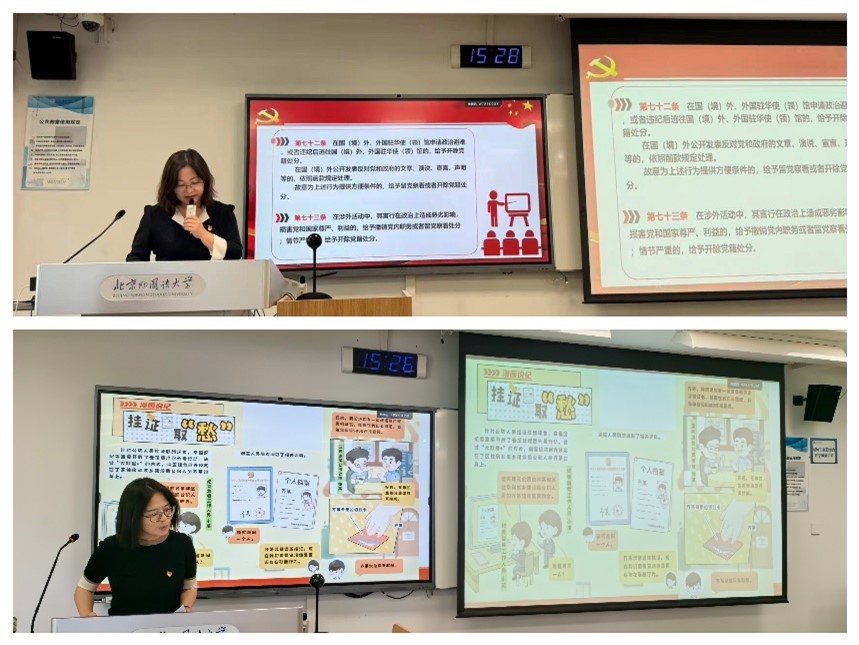之后,为推动党纪学习教育在党员教师中走深走实,SUNBET申博教工一支部和二支部分别进行了支部党纪学习。一支部书记钟珊和二支部书记曾琼分别在本支部讲授专题纪律党课,两位书记以讲促学、以讲带学,结合具体案例对党员教师进行了警示教育。