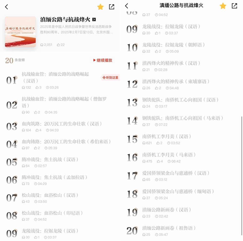 调研结束后,党支部成员依据调研成果,制作了以“滇缅公路与抗战烽火”为主题的双语音频专辑20条,并于近日在“学习强国”平台发布。此次作品上线,不仅展现了两院青年学子用外语讲好中国故事的能力,也为红色历史在新时代的传承与传播注入了青春力量。