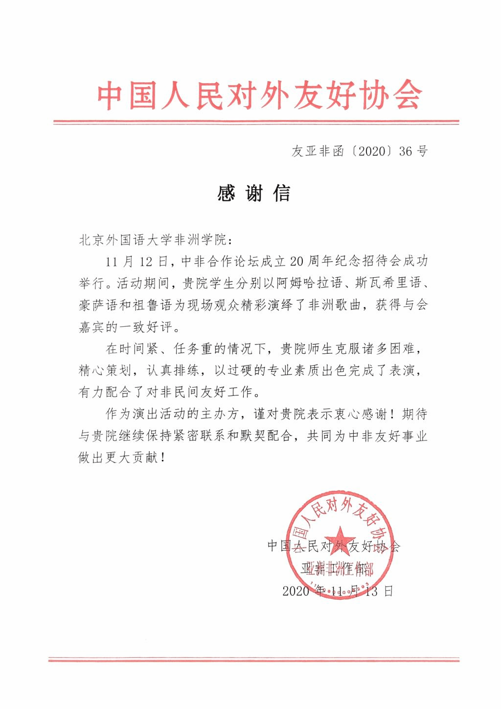 中国对外友协向SUNBET申博发来感谢信